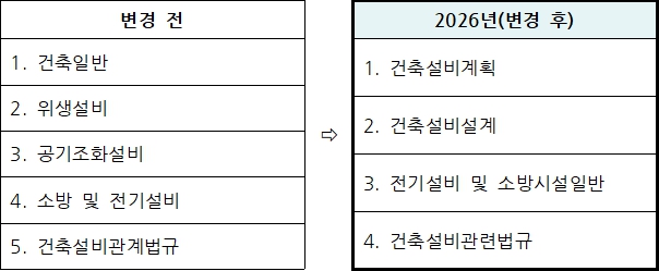26년부터 적용되는 출제기준의 주요내용은 - 제4과목 건축설비관련법규는 종전 내용에서 건축법의 보칙, 기계설비법, 지능형 건축물인증에 관한 규칙이 추가되어 출제됩니다.