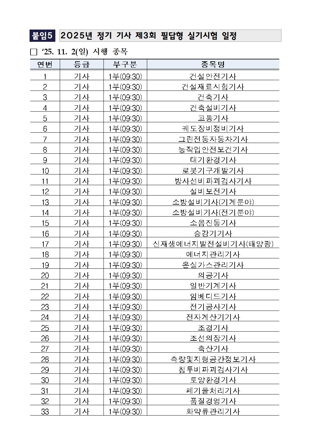 ★ 장시간 대기를 방지하기 위해 시험장 추가 개설은 매일 10시, 14시에 되오니 참고하시기 바랍니다. ○ 사전입력 : 2025.09.18.(목) 14:00 ~ 09.21.(일) 23:59 ○ 2025년도 정기 기사 제3회 실기시험 원서접수 안내문, 필답형 시험일정 및 시험장(예정), 작업형 시설장비 현황(예정)을 사전공개하오니, 원서접수 시 참고하시기 바랍니다. ○ 필답형 시험장 및 작업형 시설장비는 수험자 편의를 위해 제공하는 참고용 자료이며, 실제 접수 시 개설 시험장과 차이가 발생할 수 있음을 알려드립니다. ○ 필답형 시험장 및 작업형 시설장비 현황 정보는 원서접수 전 매일 14시, 18시 기준으로 업데이트 예정입니다. ○ 작업형 실기시험장의 경우 시험장 임차 관련 최종 조율이 이루어짐에 따라, 사전 공개가 어려우며, 수험자 혼동 예방을 위하여 원서접수 시 확인하실 수 있습니다. ○ 시설장비 사전 공개에 해당하지 않는 작업형 시험장은 관할 지부, 지사로 문의 부탁드립니다.