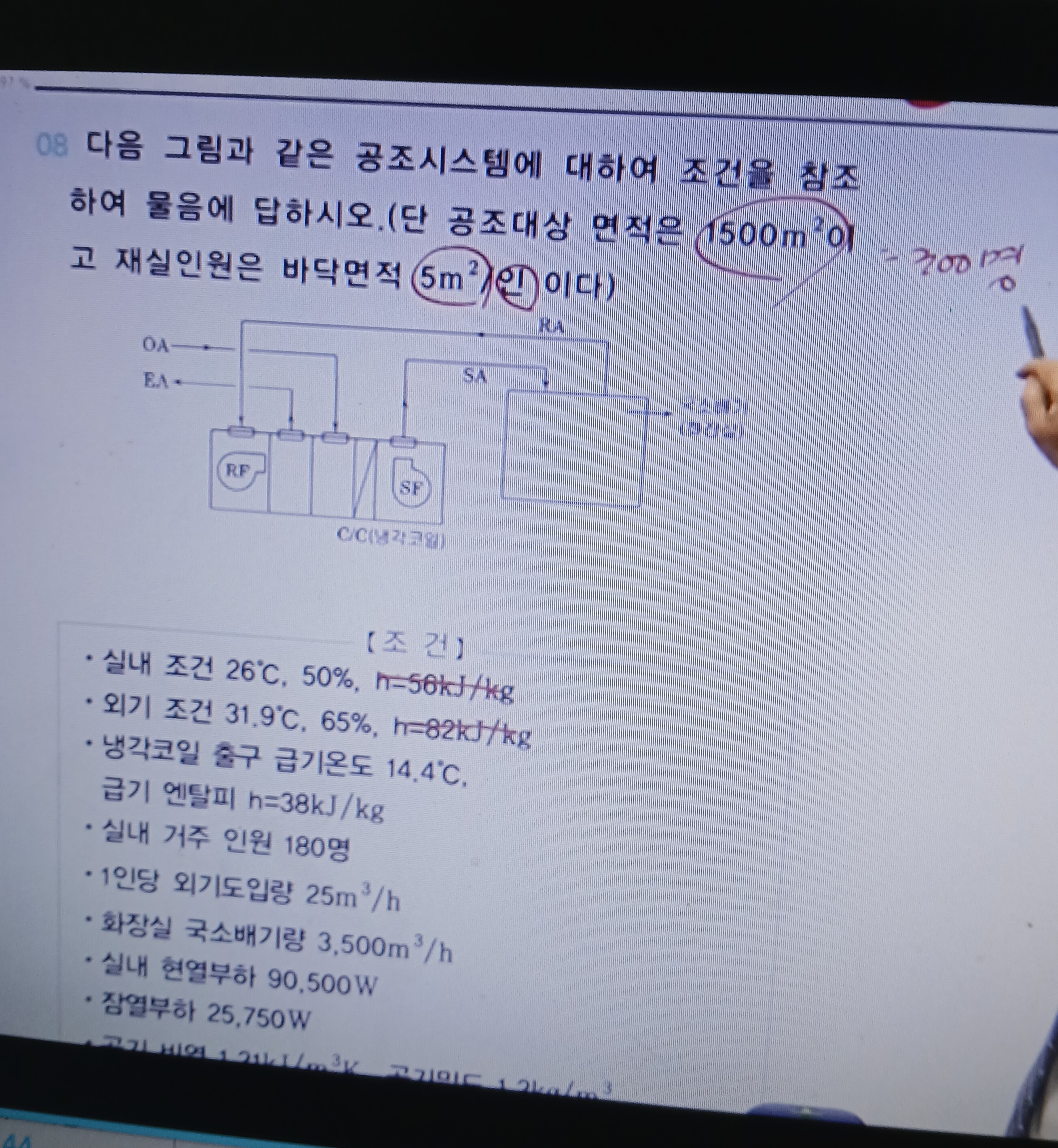 25년도 문제에서는 조건을 2개 (공조대상 면적 1500제곱미터 + 재실인원은 바닥면적 5제곱미터/인 .. 실내거주인원 180명), 19년도 문제에서는 실내거주인원 100명만 제시