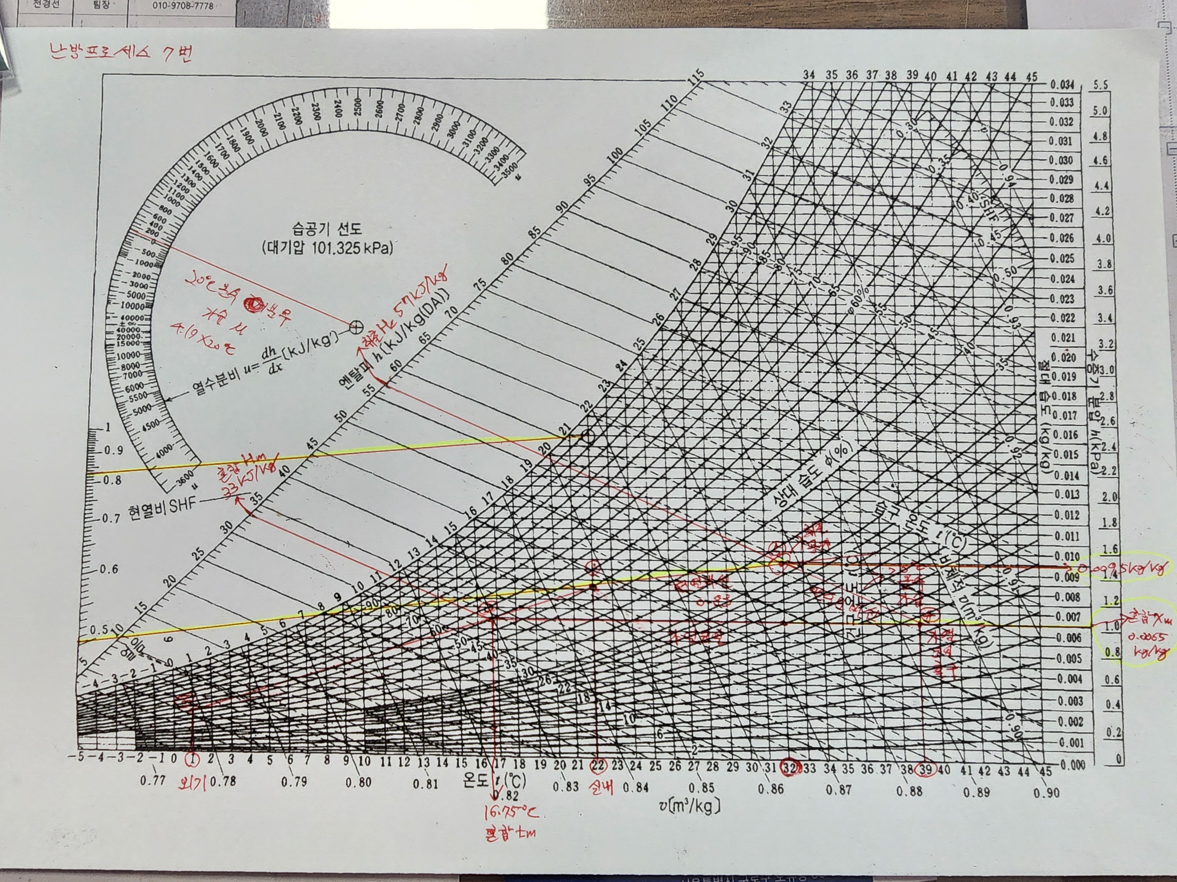 그런데 이번 문제 같은 경우 실내온도의 절대습도값이 교재와 제가 작도한 값이 무려 0.0005나