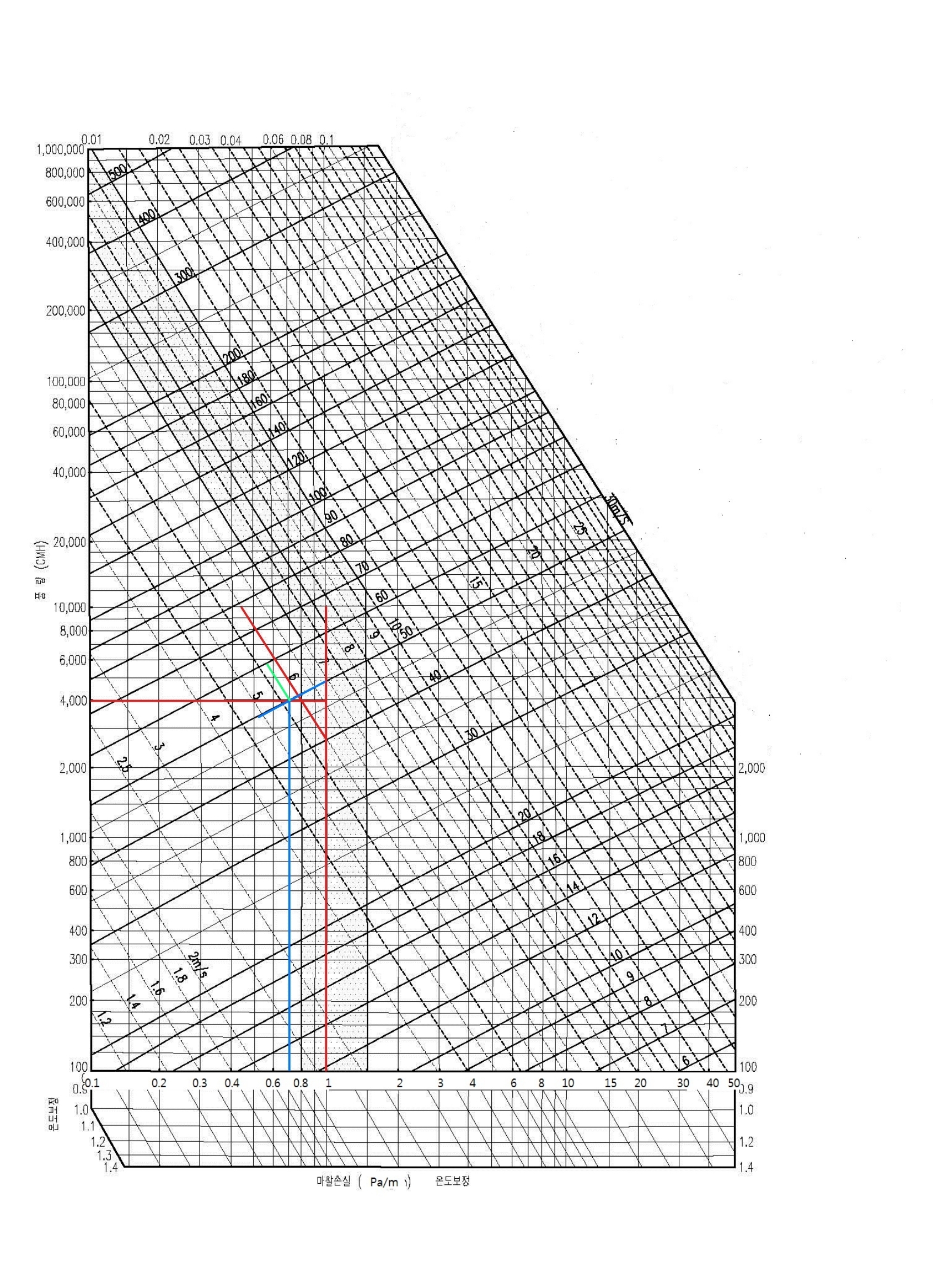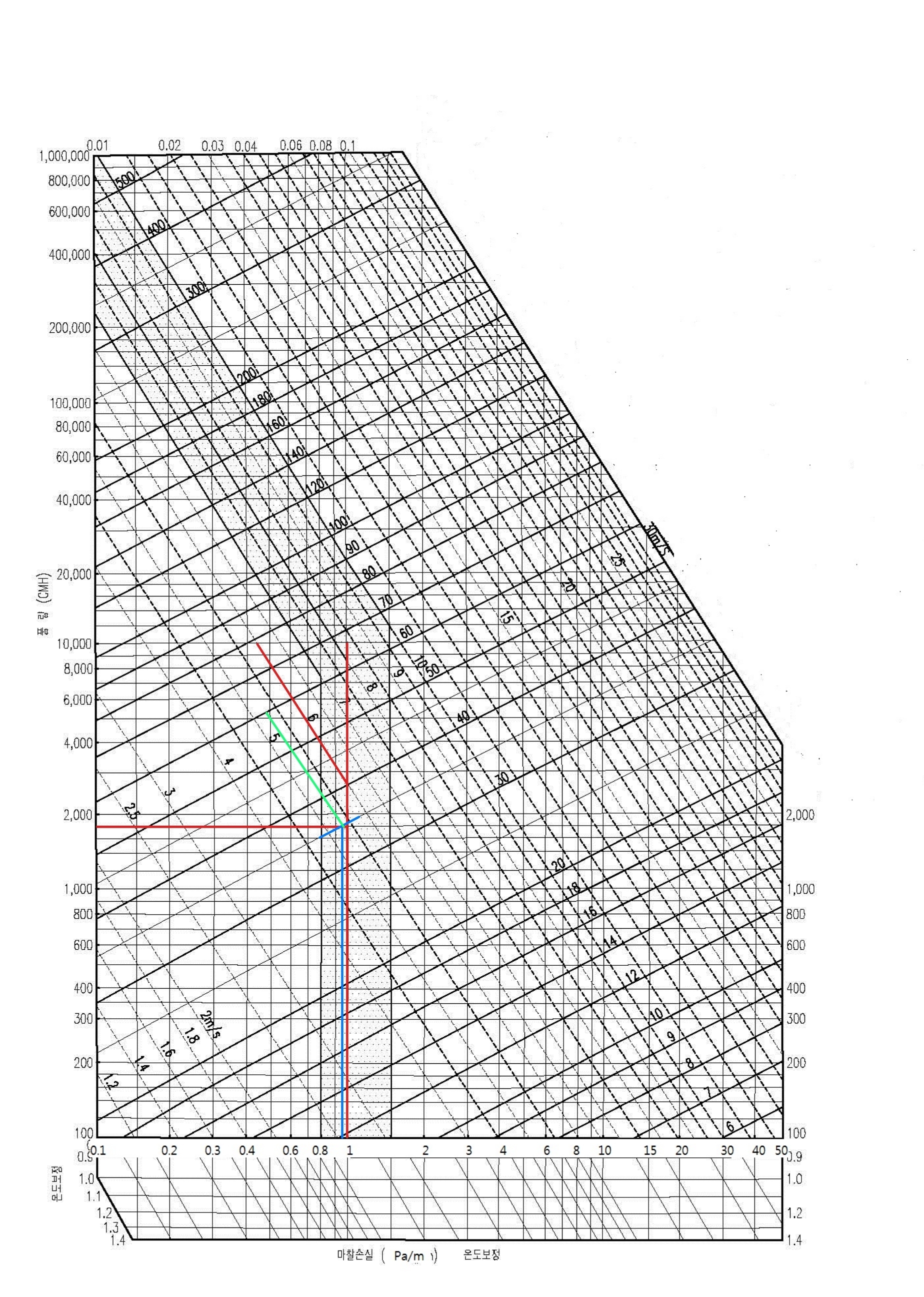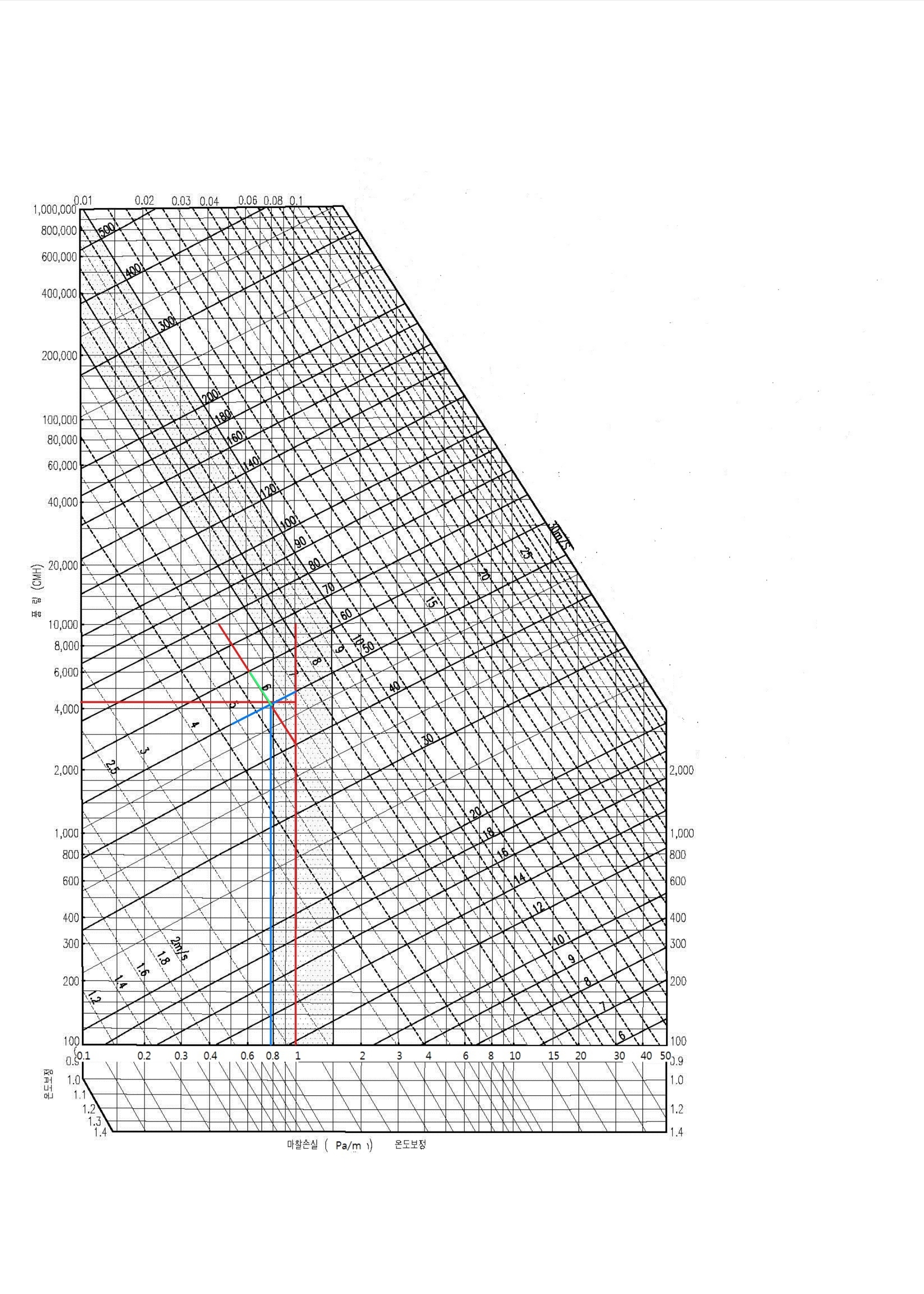 ( 파란선은 덕트경과 마찰저항, 초록선은 풍속 : 이하 동일)