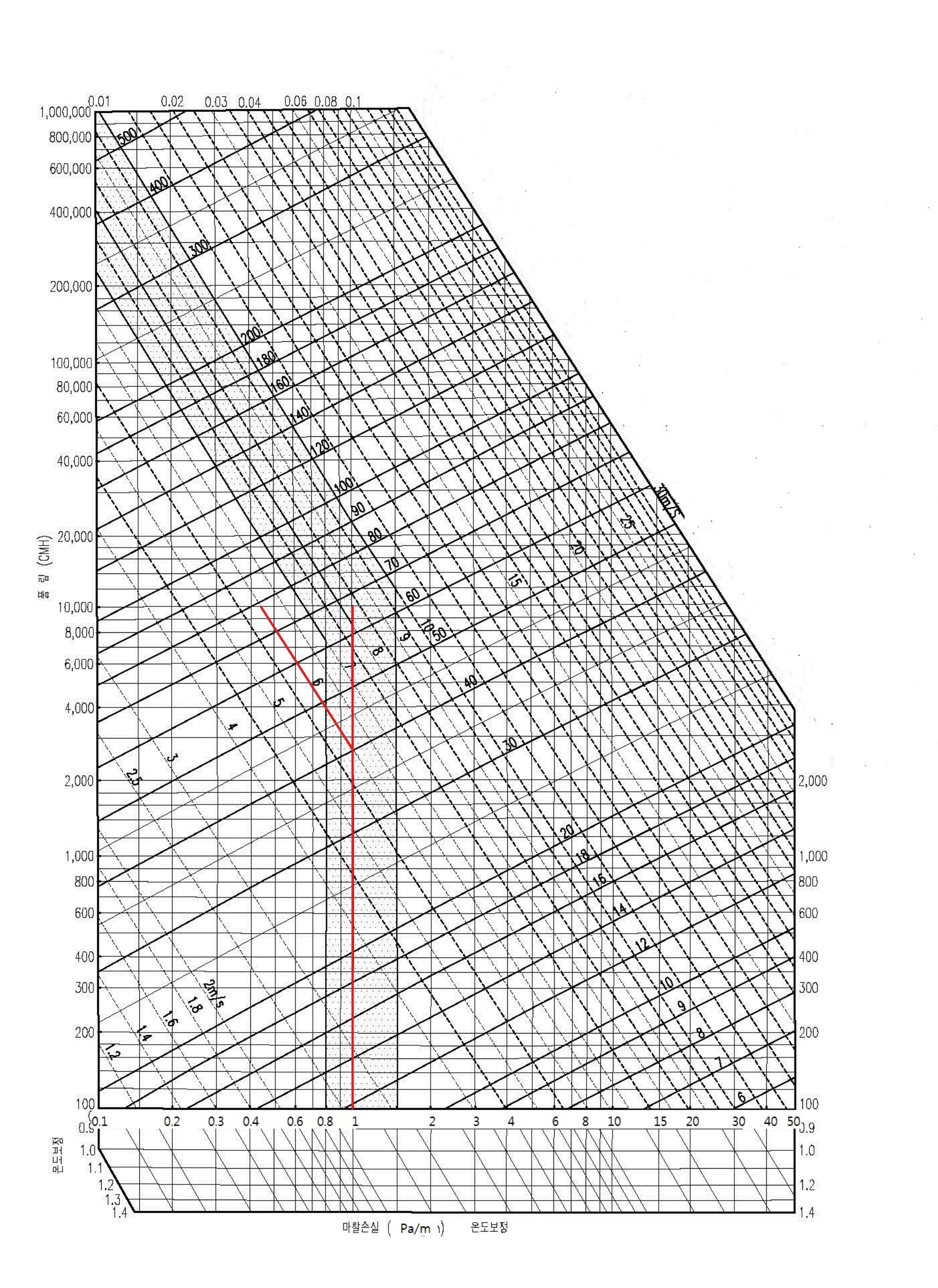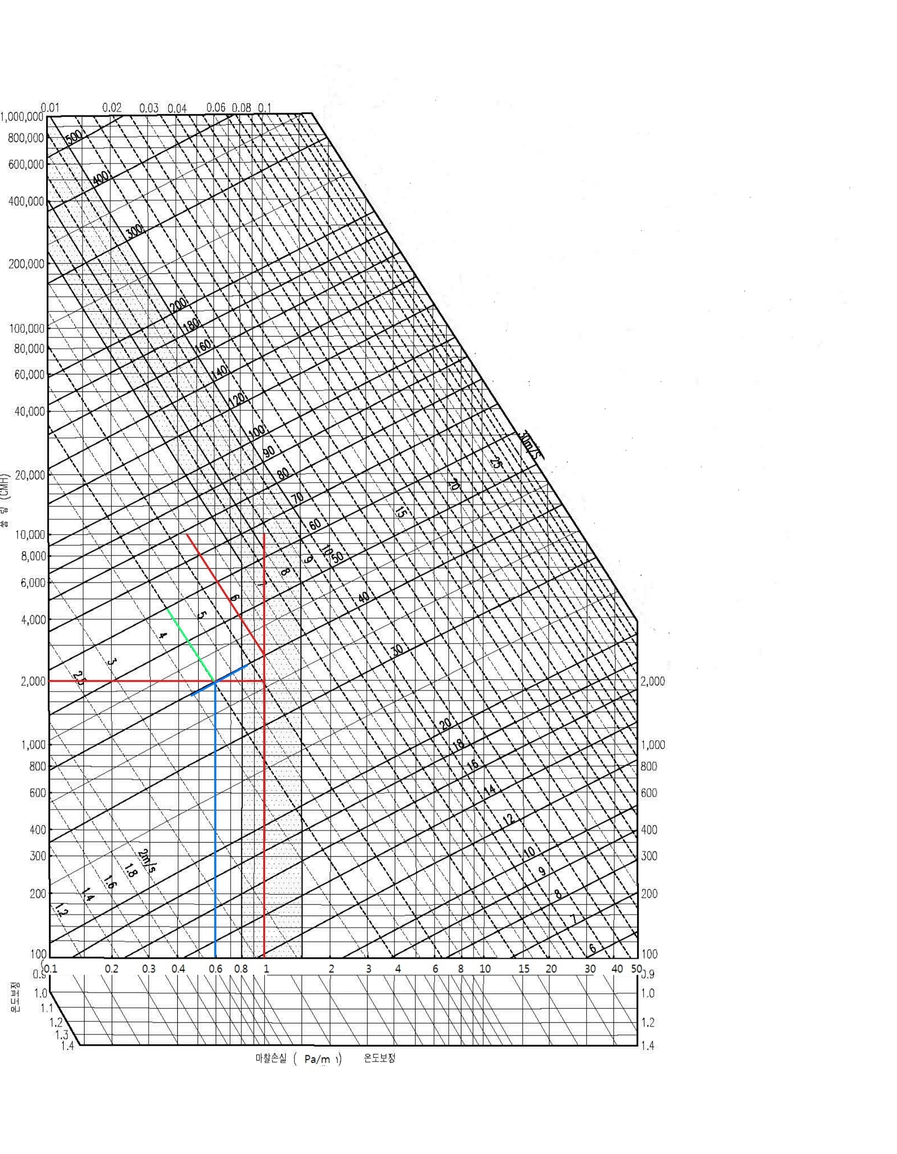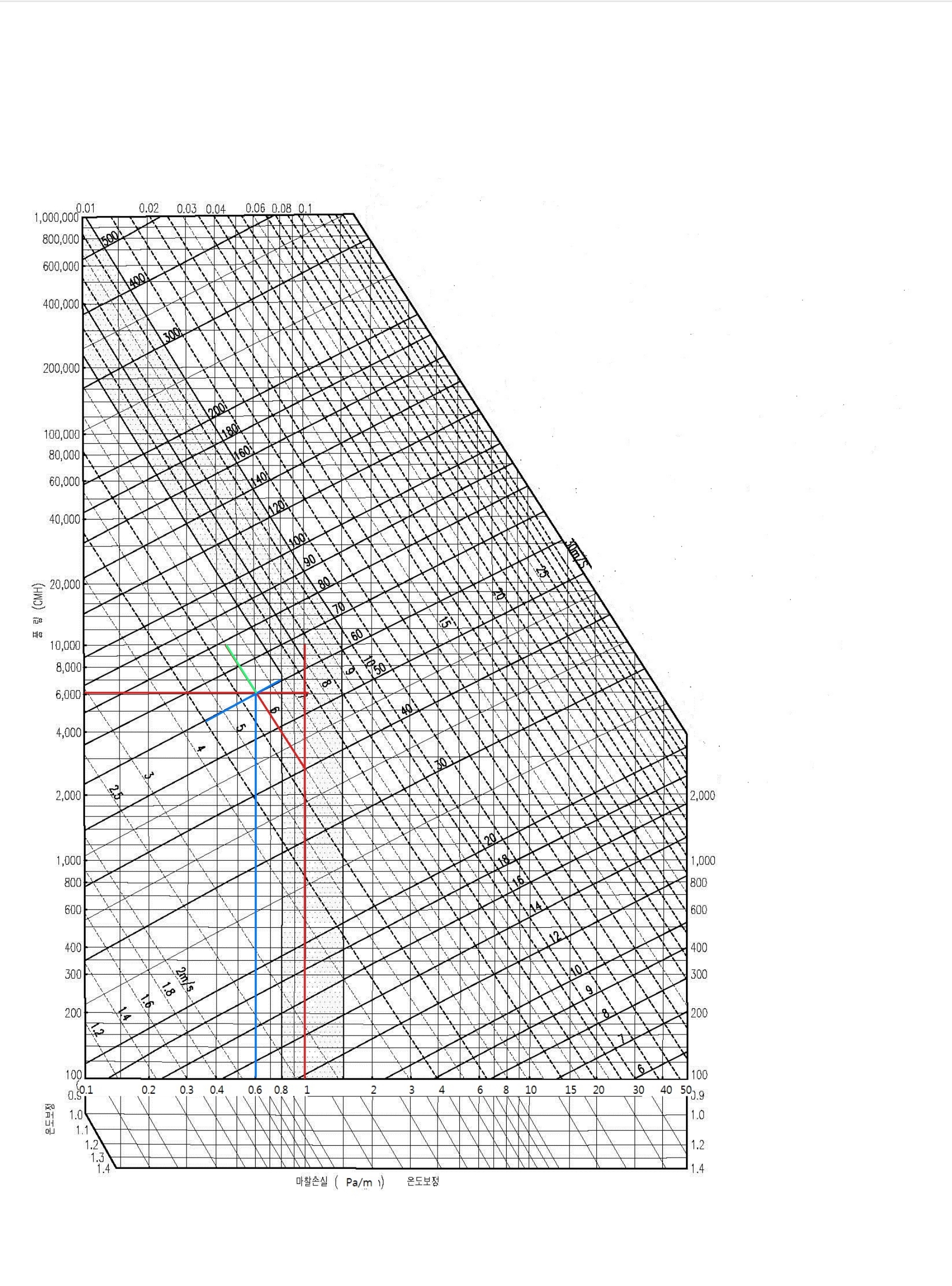 ( 파란선은 덕트경과 마찰저항, 초록선은 풍속 : 이하 동일)