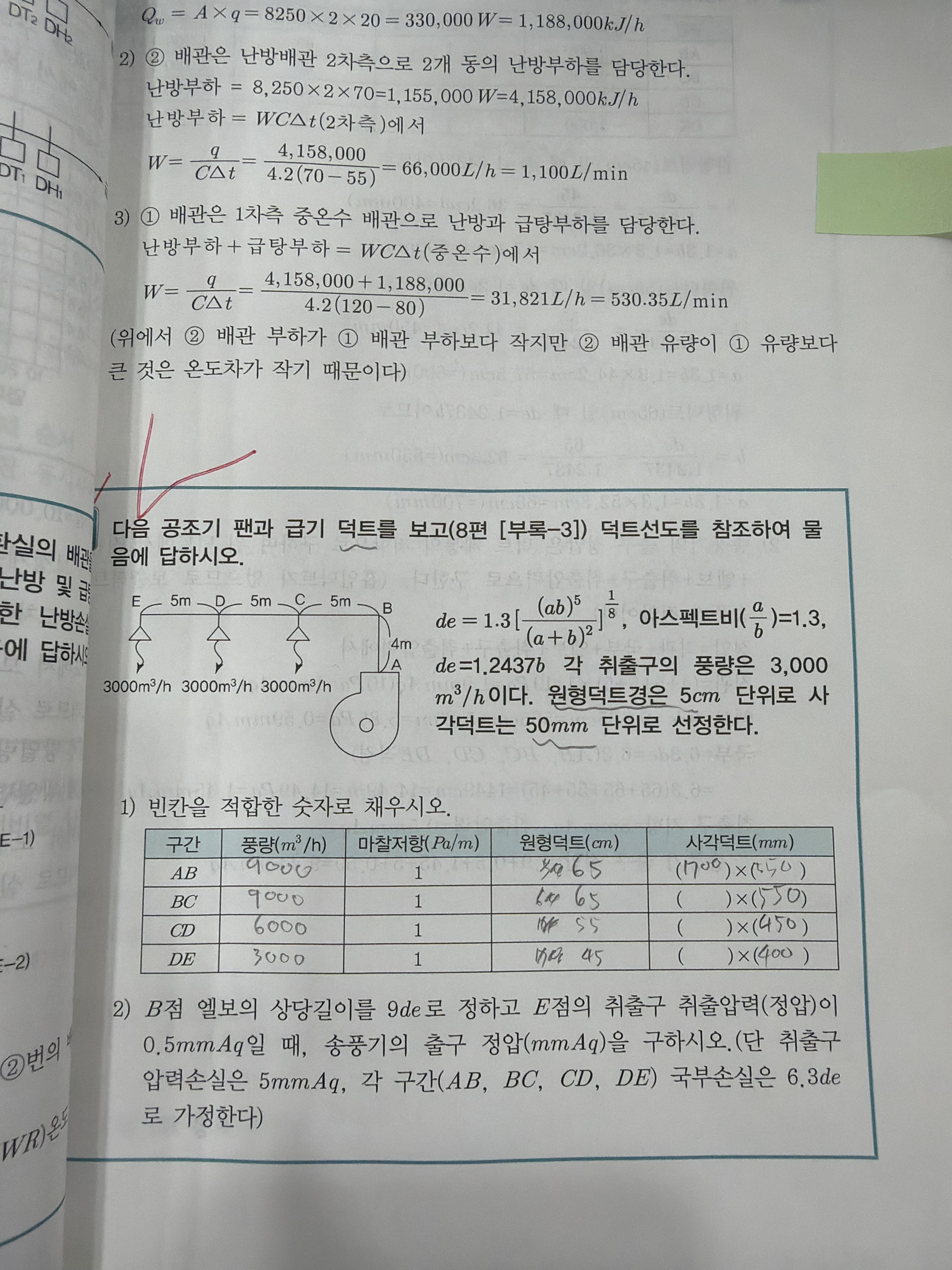 1번) 송풍기 출구 정압을 구할 때, 직관의 길이와 이에따른 마찰저항을 곱하여 직관의 저항을 구하잖습니까. 그런데 이 문제는 덕트의 단위를 5cm로 한다고 나와잇어서 실제마찰저항이 문제에서 나온 1pa/m가 아니게 됩니다. 각 구간별 마찰저항이 달라지지요. 그런데 답지에는 배관길이를 실제 마찰저항이 아닌, 문제에서 준 1pa로 전부 곱하였습니다. 해설이 잘 못 된 것인지 궁금합니다.